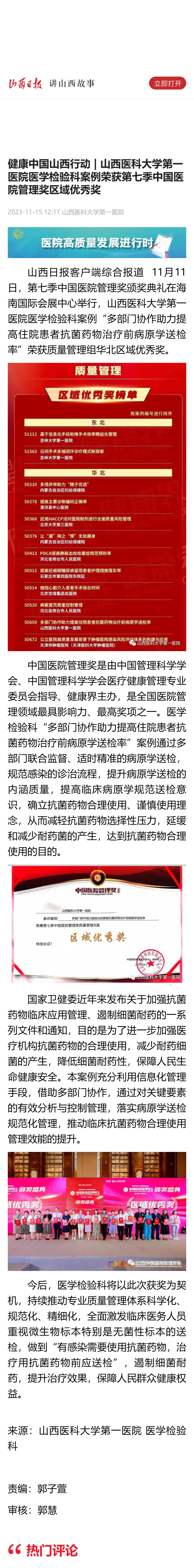 山西日报客户端|健康中国山西行动 | 成人探花 医学检验科案例荣获第七季中国医院管理奖区域优秀奖