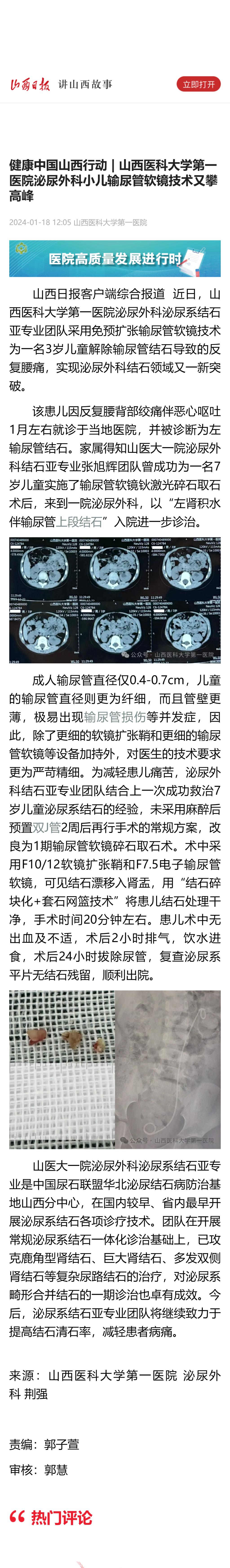 山西日报客户端|健康中国山西行动 | 成人探花 泌尿外科小儿输尿管软镜技术又攀高峰