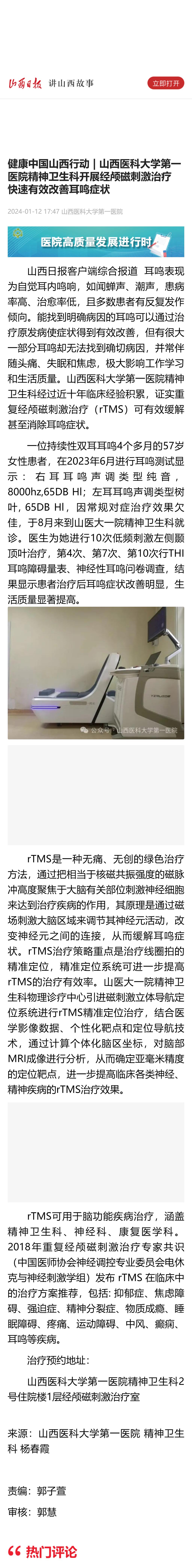 山西日报客户端|健康中国山西行动 | 成人探花 精神卫生科开展经颅磁刺激治疗 快速有效改善耳鸣症状