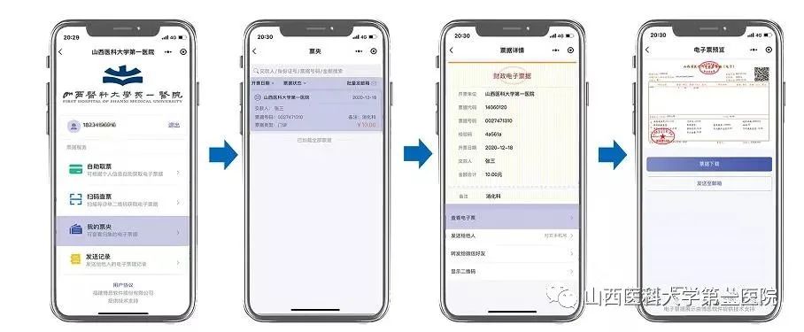2.通过医院门诊楼、1号住院楼、5号住院楼、博爱病区的“票据打印终端”扫描身份证或缴费凭条上的二维码获取电子票据。 3.通过山西省财政厅电子票据查验网站://cztyw.shanxi.gov.cn:17009/bcweb下载个人查询电子票据。 4.微信搜索“电子票夹”小程序,在“我的票夹”中查看电子票据。 自此,山医大一院成为山西省首批实现门诊、住院电子票据系统整体运行的医院。此举不仅降低了院区内交叉感染的风险,为医院节约了打印机和纸质等耗材,同时也避免了患者因个人原因导致票据丢失,进一步改善了患者就医体验。