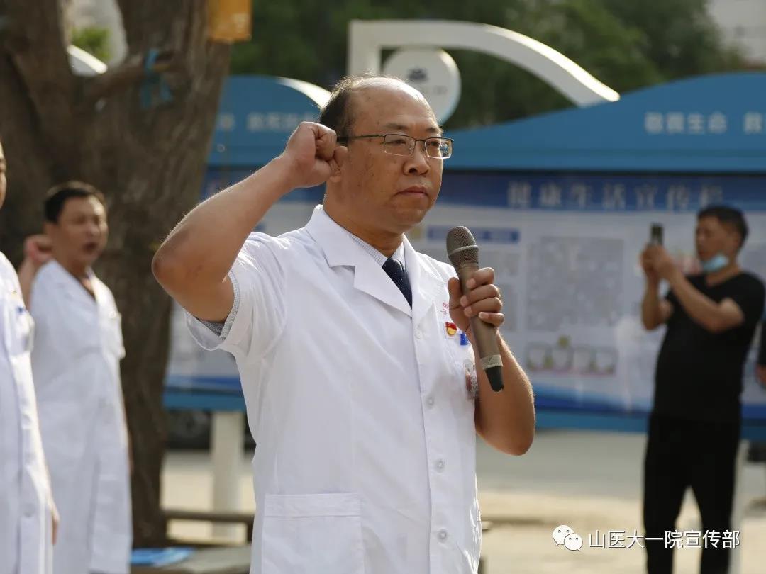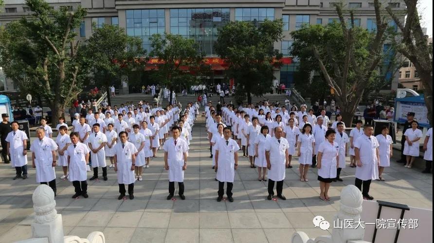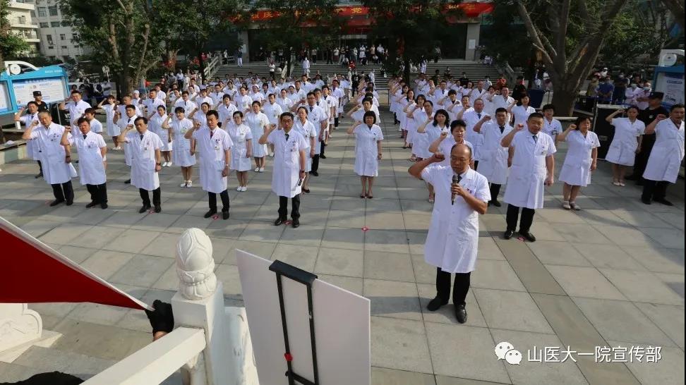 在一号住院楼前广场举行庆祝建党99周年新党员入党宣誓暨老党员重温入党誓词仪式。全体在院领导、2020年新发展党员、在抗击新冠疫情一线入党的党员、老党员代表100余人参加宣誓仪式。院党委副书记、院长徐钧主持仪式。