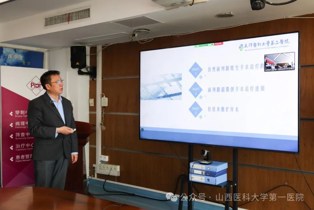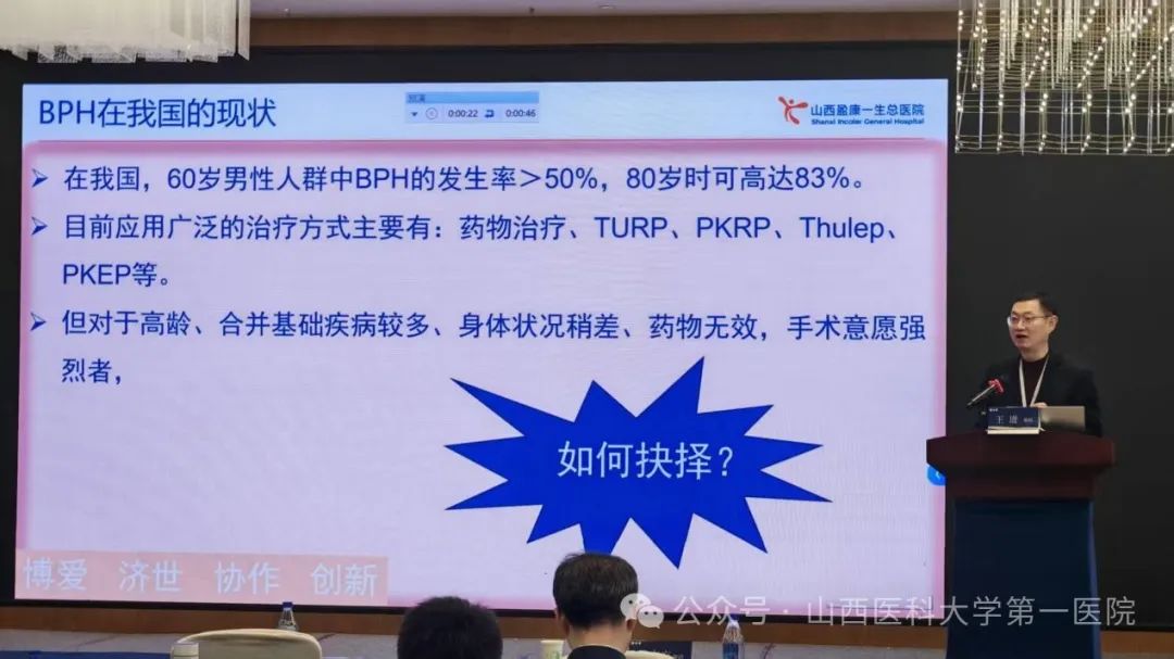 众多省内专家围绕前列腺疾病的不同领域展开分享,山医大一院茹峰讲解了“小体可多华——早治首选,强效速达”,尹楠讲解了光纤铥激光在泌尿外科的应用;山医大二院王璟琦阐述了“探讨饮食结构与前列腺癌发生的风险”;山西白求恩医院程伟介绍了膀胱颈挛缩的诊疗进展;山西省肿瘤医院崔嵛探讨了前列腺癌新辅助治疗;吕梁市人民医院王旺龙介绍了逆行分层解剖性蓝激光前列腺汽化术;山西盈康一生总医院王进分享了前列腺热蒸汽消融术经验;山西省中医药大学附属医院梁志刚分享了“LUTS/BPH流行病学现状临床治疗方案及案例”。专家们的报告涵盖前列腺疾病多个方面,展示了当前的研究热点和最新成果,为临床实践提供了有力的理论支持。