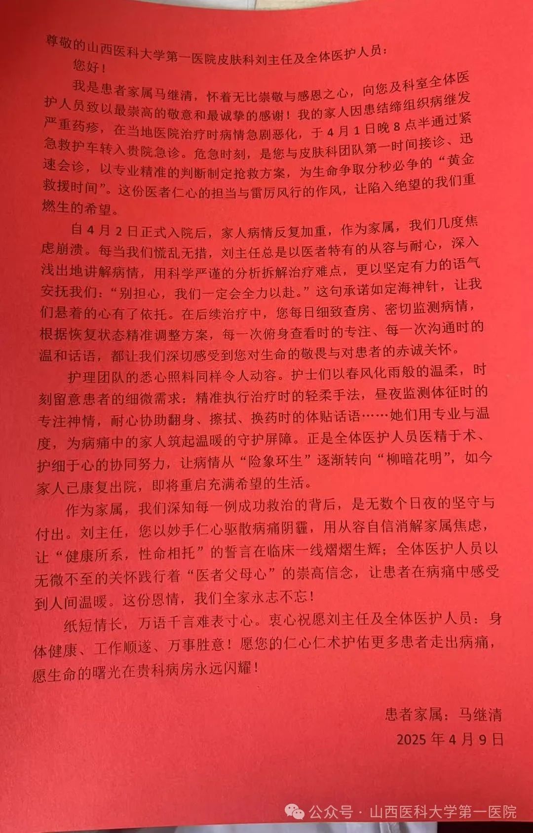 中毒性表皮坏死松解症的平均死亡率高达25%-35%,此次成功救治不仅彰显了山医大一院在重症皮肤疾病的救治能力,更体现了“以患者为中心”的服务理念。每一面锦旗都是患者的“生命勋章”,激励着皮肤科每一位医护在守护健康的道路上继续精益求精,今后将继续以精湛医术为盾、以赤诚仁心为灯,照亮更多患者的康复之路。