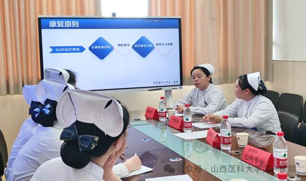 此次查房聚焦1例系统性红斑狼疮患者的个体化综合管理,首先通过病例汇报、体征分析及实验室检查解读,责任护士从营养状态、心功能水平、血栓风险及康复需求四大维度进行了系统性评估,提出“个性化营养干预”“心功能动态监测”“血栓预防体系构建”“阶梯式康复训练”四个护理难点问题。李丹医师详细解读了心衰最新诊疗指南,指导早期识别早期干预;徐倩倩医师针对因疾病导致的代谢异常,定制了更完善的饮食方案;中医科吴桐护士提出依据辩证施护进行中药调理与穴位按摩,助力其症状缓解;康复医学科田佳佳护士提出应遵循正确的康复原则进行循序渐进的功能锻炼,改善生活质量。