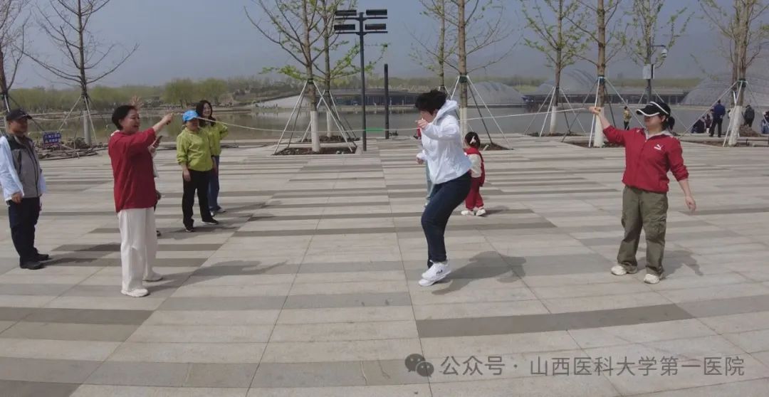 参观间隙,一场别开生面的团队拓展活动掀起热潮。跳大绳、抢水瓶、丢手绢等经典游戏唤醒大家的童年记忆,夹乒乓球、喊数抱团等项目考验反应能力,八段锦则在刚柔并济中传递传统养生智慧。各小组队员齐心协力、默契配合,现场加油声、欢笑声此起彼伏。轻松有趣的活动不仅让大家放松了紧绷的神经,更增强了团队凝聚力,同时促进了不同科室同事间的交流,倡导了积极健康的生活方式。