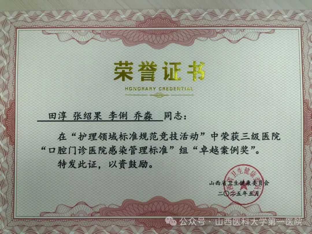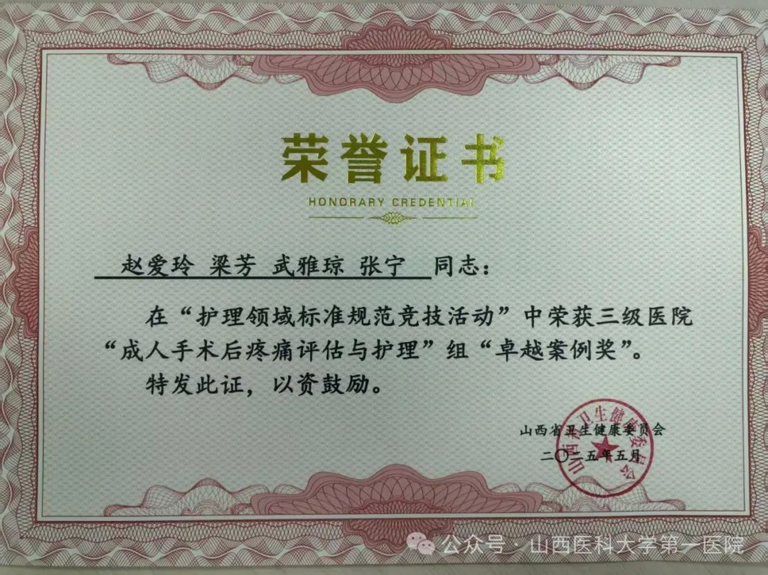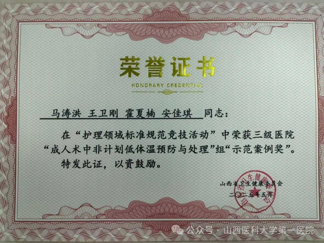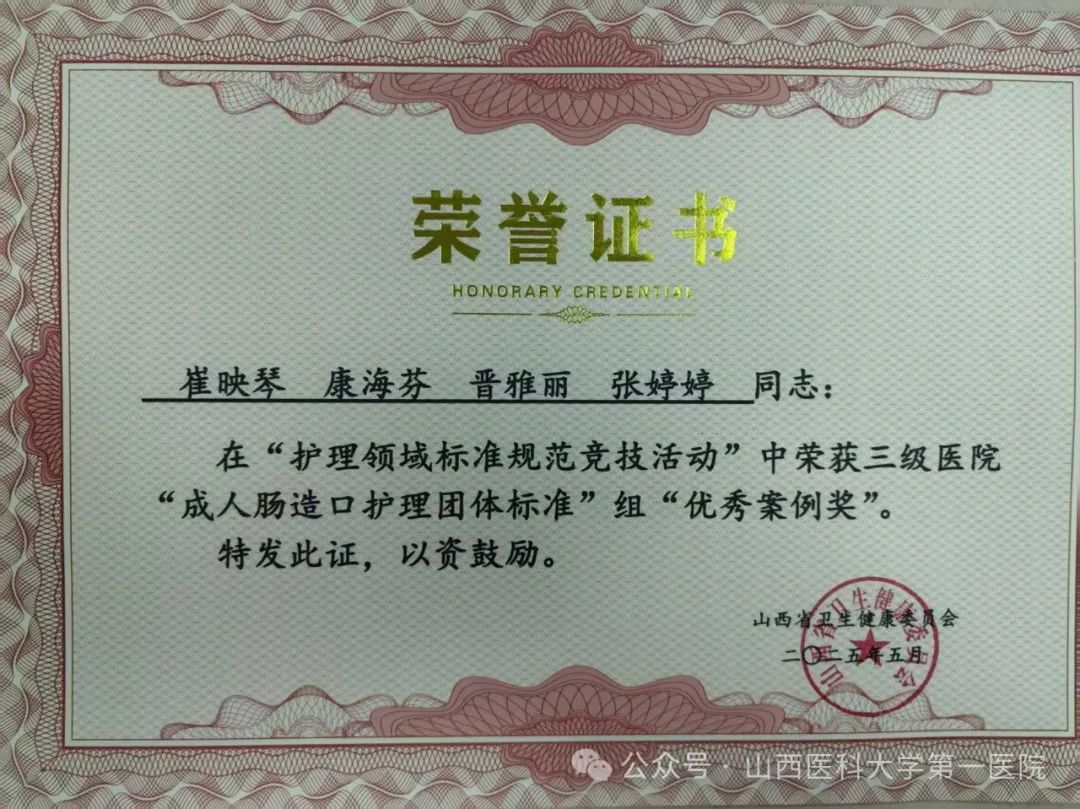 在赛道四《成人术中非计划低体温预防与处理》中,案例《践“温”贯标,护“暖”有方》获得示范案例奖;赛道六《成人肠造口护理团体标准》中,案例《三维聚力,护愈新生——基于福格行为模型的多学科协作实践》获得优秀案例奖。同时,山医大一院凭借卓越的组织能力和案例质量,摘得团体优秀组织奖。