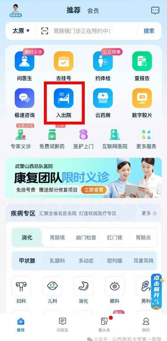 (1)健康山西APP—入出院—绑定住院号—自助入院/自助出院