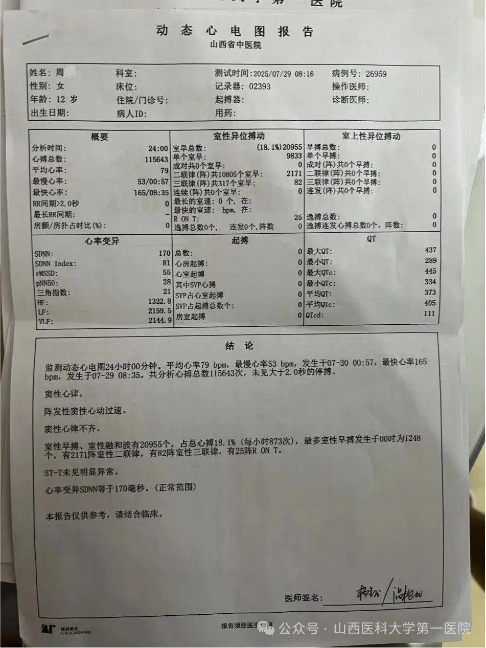 室性早搏又称室性期前收缩,是心脏在正常跳动前突然出现额外心跳,这种异常心跳由某个心室区域过早发出电信号,导致心肌提前收缩,部分人可能会感觉到心悸、胸口突然“漏跳感”或“重击感”。频发的室性早搏若不及时干预,可能早早地影响心脏功能,甚至导致心肌病变,而R-on-T现象更是提示室速、室颤等恶性心律失常的风险,一旦发生危及生命。虽然此次动态心电图并未发现恶性心律失常,但是小周既往心悸时偶尔伴随黑朦、头晕的症状却让家长不得不往坏处着想。