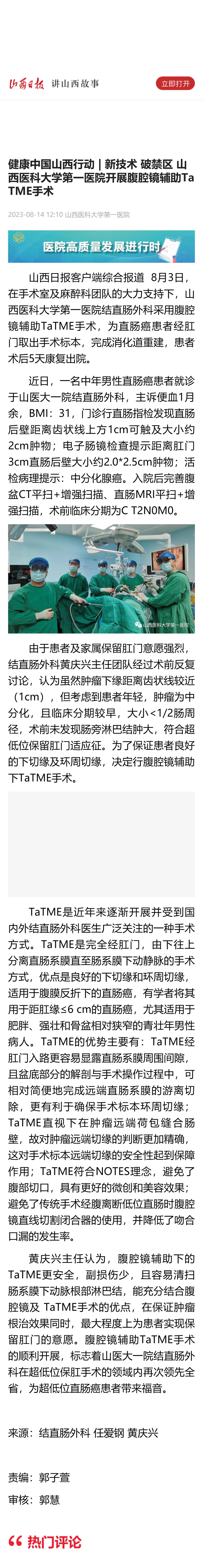 山西日报|健康中国山西行动 | 新技术 破禁区 成人探花 开展腹腔镜辅助TaTME手术