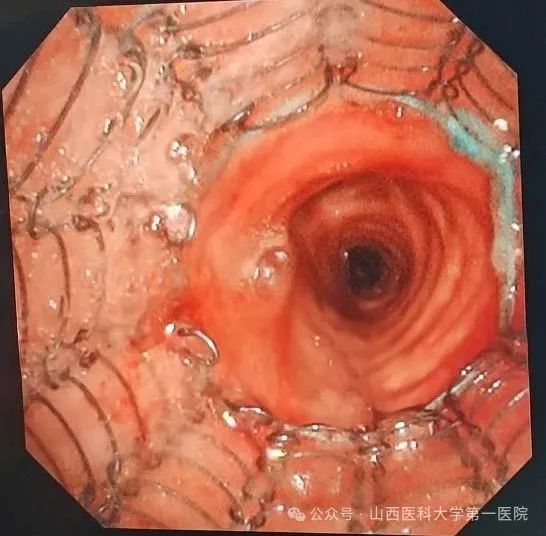 5月10日下午,重症医学科高海晋医生敏锐察觉到患者血氧饱和度下降,呼吸与危重症医学科呼吸介入团队得知情况后快速响应,尹建升医生与李艳青护士为患者行床旁支气管镜检查,发现气管支架移位,这是气管支架置入术后的常见并发症,经过调整后支架重新支撑起气管狭窄部位。